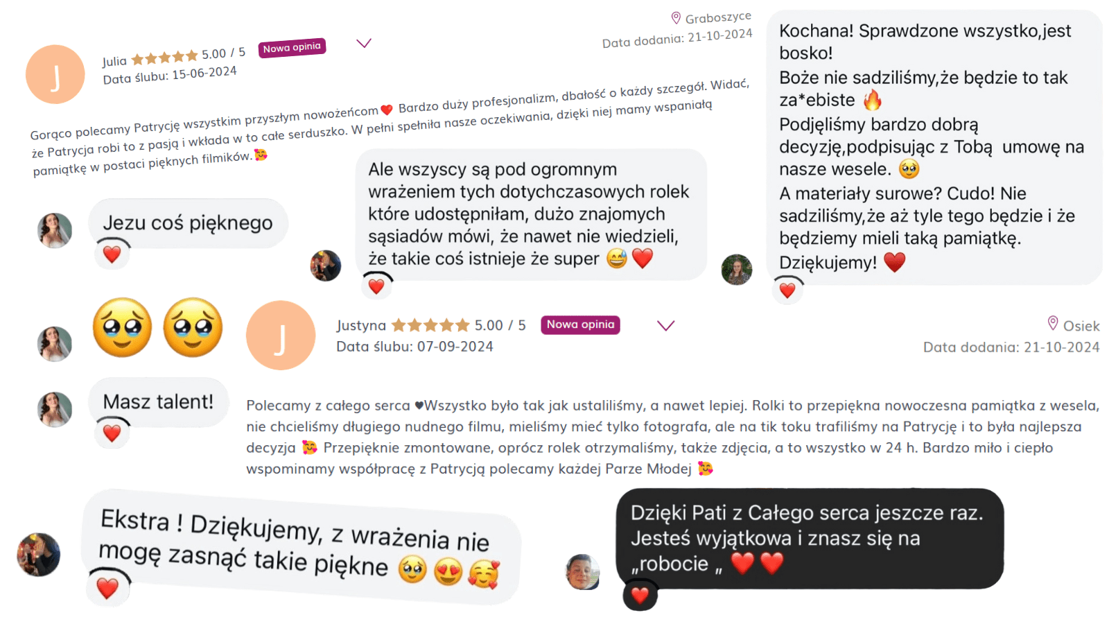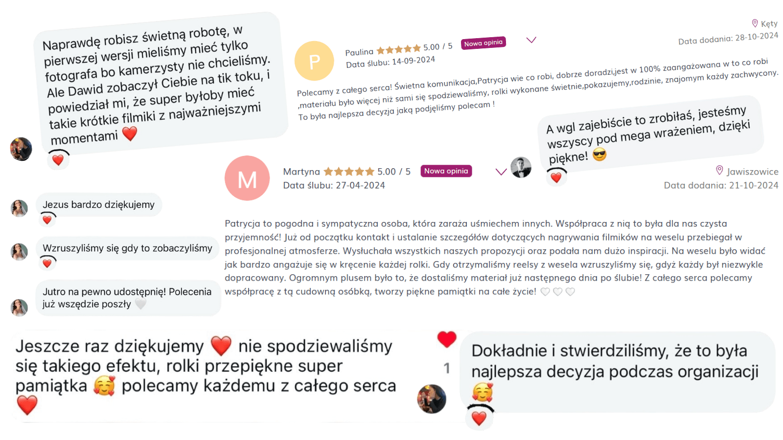 2 tygodnie/tydzień przed weselem dostarczacie plan wesela i ustalamy wszystkice szczegóły. Przedstawienie moich propozycji i wysłanie Waszych. Wspólnie ustalimy jaki styl Wam się podoba, czy są może jakieś trendy, które chcielibyście nagrać. dzień wesela: nagranie przeze mnie materiałów oraz zapłata reszty wynagrodzenia.